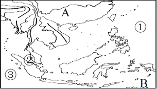 ①马六甲海峡位于马来半岛与爪哇岛之间