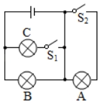 B.当S₁、S₂都闭合时,A、B、C三灯均发光