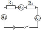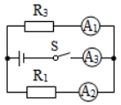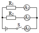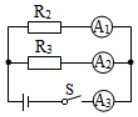 4.小兵在探究电路的电流规律实验时用了下列选项中的某个电路,已知R₁=R₂<R₃,电流表1、2、3的示数分别是0.22A、0.3A和0.52A,则由此推断所用电路应是( )