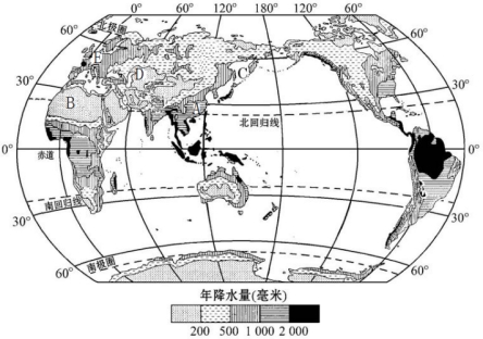 (2)A地与B地都在________(纬线)附近,B地的年降水量约是________毫米以下。