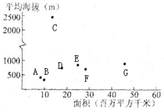 下图是七大洲的面积和大洲地面平均海拔关系示意图(图中字母为各大洲的代号)。据此回答下列1至5题。