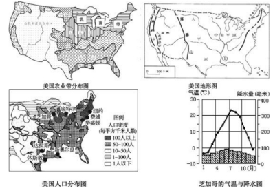 (1)读材料一,美国地形图中的①是________河,②是________湖。